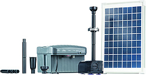 Solární podvodní filtrace vše v jednom, do objemu jezírka 1 m3. Celoplošný filtrační povrch, včetně filtračních médií, dva vodní efekty. UV lampa 5 W. Výkon 600 l/h. Ve slunných dnech provoz na solární energii zdarma. Možnost díky dodávanému trafu zapojení i do sítě.