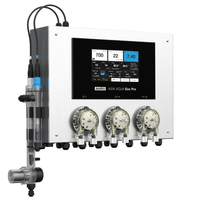 Systém elektrooxidace s nízkým obsahem soli pro bazény se slanou vodou a řízení bazénové technologie. Připravujeme - dostupné od července 2026.