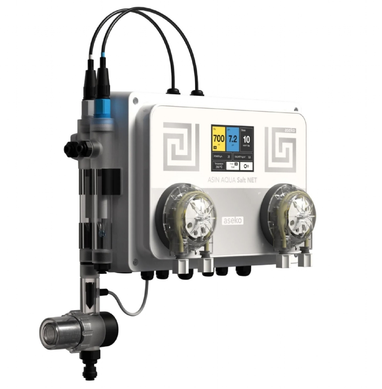 Kompaktní elektrolyzér pro automatickou úpravu vody v bazénu, který zajišťuje přesnou dezinfekci a regulaci pH pomocí sond Aseko.