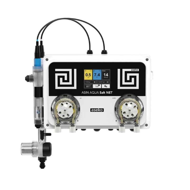 ASIN AQUA Salt NET CLF je kompaktní dávkovací zařízení pro efektivní a spolehlivou úpravu bazénové vody. Je vybaveno senzorem CLF pro přímé měření volného chloru a pH senzorem pro automatickou regulaci pH. Zařízení nabízí základní funkce pro správu bazénové technologie, vhodné pro každodenní provoz domácích bazénů. Stabilní řízení dezinfekce zajišťuje řízená elektrolýza slané vody. Nová titan–iridiová elektroda Ti20 vyrábí až 20 g chloru za hodinu při koncentraci soli 4 g/l.
