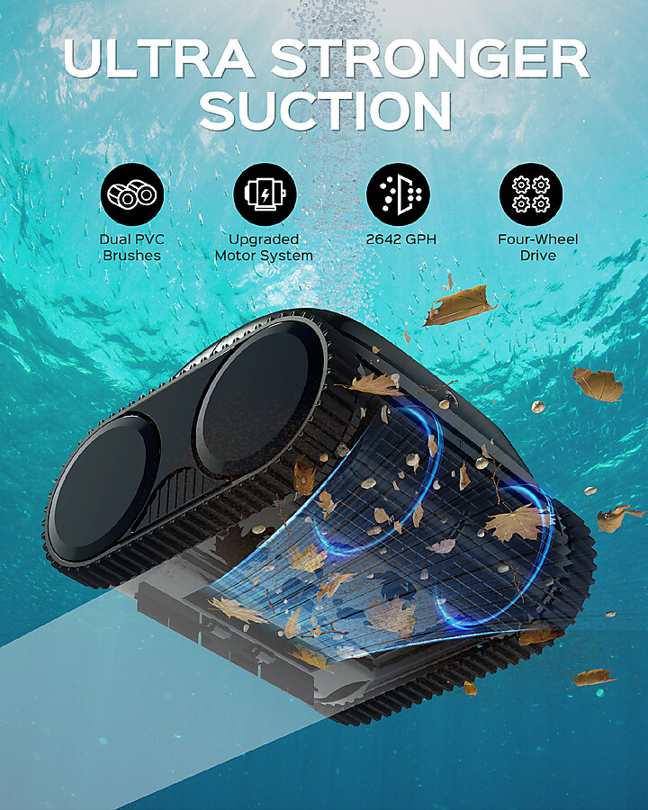 Dva rotační kartáče uvolní i odolné nečistoty ze dna i stěn bazénu, zatímco 3 výkonné motory zajistí jejich okamžité nasátí. Výsledkem je důkladné čištění během jednoho cyklu.