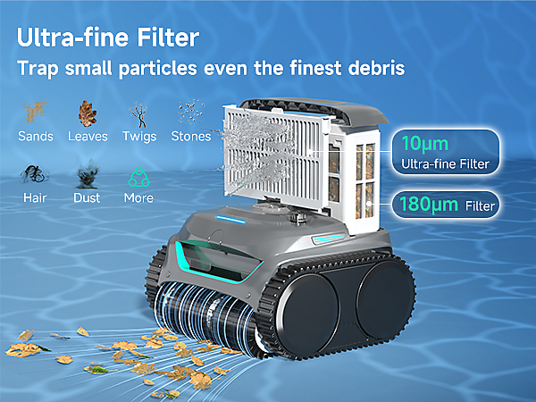 WYBOT C2 kombinuje filtrační koš (180 µm) s ultra jemným filtrem (až cca 10 µm), který zachytí i velmi drobné nečistoty. Díky tomu odstraní nejen listí a písek, ale i prach, řasy nebo jemný zákal – výsledkem je viditelně čistší voda.