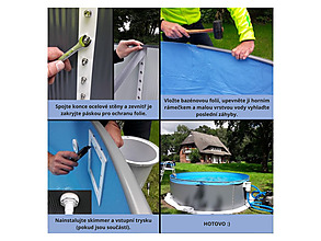 Montáž probíhá pomocí spodních a horních lišt, do kterých se zasazuje ocelová stěna. Spojení stěny šrouby vytváří pevný kruh a zavěšená fólie se překlápí přes horní hranu. Konstrukce je navržena tak, aby byla montáž zvládnutelná svépomocí při dodržení montážního návodu.