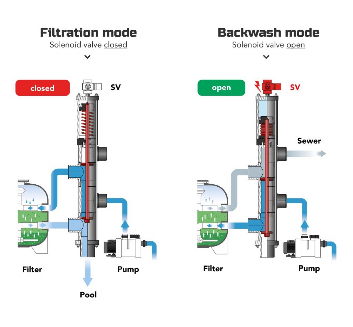 Špičkový švýcarský ventil pro automatické zpětné proplachy pískových filtrů.