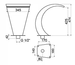 Vodní chrlič. Materiál nerez AISI 316L. Napojení 1 1/2 "in. Rozměry (š / v / h): 345 x 474 x 170 mm