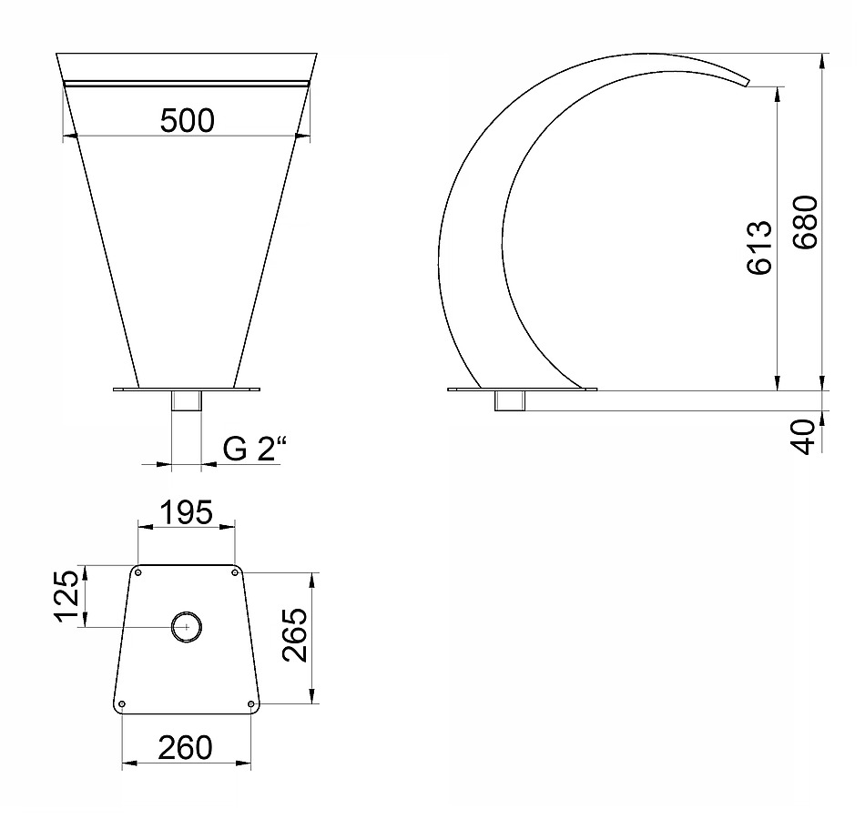 Vodní chrlič, Materiál: Nerez AISI 316L, Napojení (int.): 2 "ex, Rozměry (š/v/h): 500 x 680 x 265 m