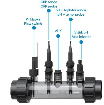 - Vestavěné senzory pH, teploty a průtoku, volitelně ORP