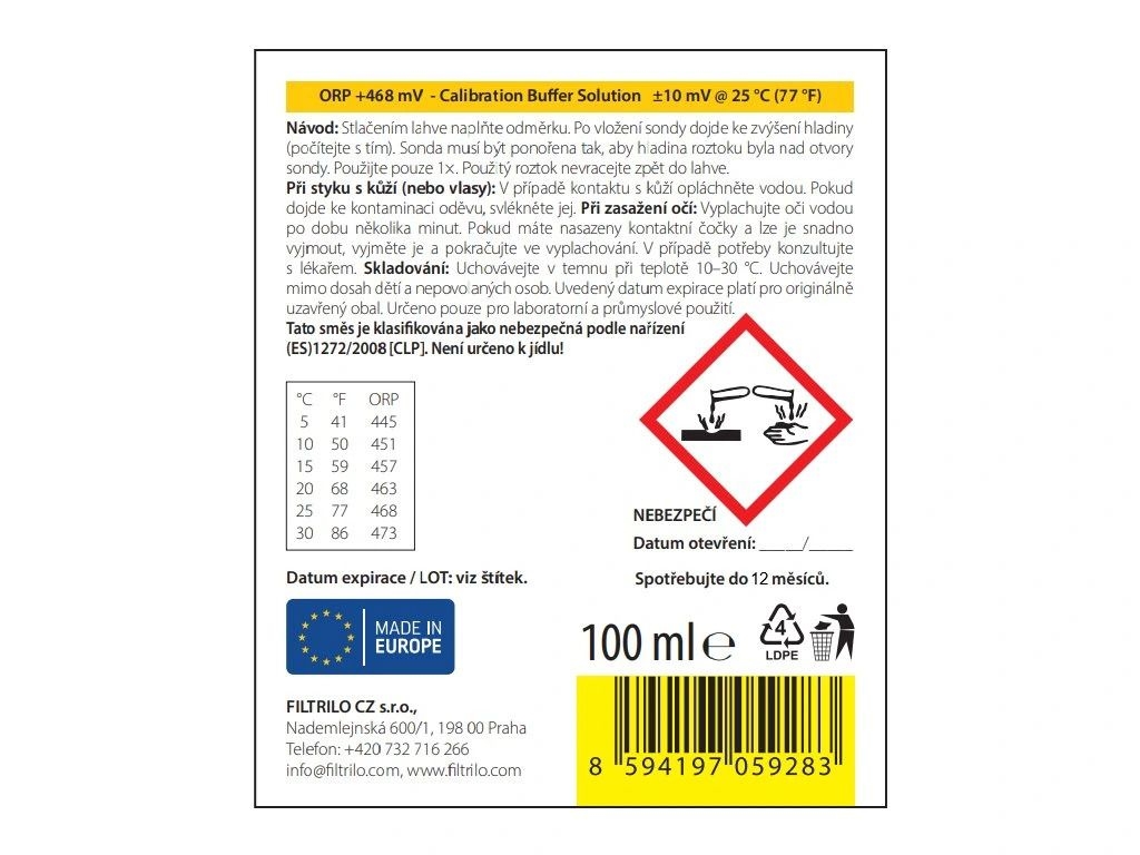 Kalibrační roztok ORP +468 mV je určen pro kalibraci a ověřování ORP (RedOx) elektrod, ORP přístrojů (ORP metrů) a ORP senzorů, a to jak v laboratorní praxi, tak v provozních a průmyslových aplikacích. Jedná se o certifikovaný kalibrační roztok s metrologickou sledovatelností, určený ke kalibraci a ověřování senzorů v průmyslových aplikacích.