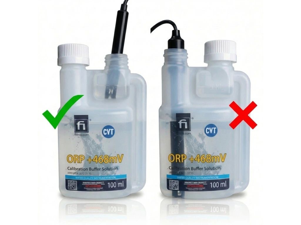 Hodnota pH je definována při 25 °C (77 °F) a etiketa uvádí také teplotní závislost, což usnadňuje korektní kalibraci i mimo standardní teplotu. Pro zachování přesnosti je nutné roztok použít pouze jednorázově. Stlačením lahvičky naplňte integrovanou odměrnou dávkovací komůrku a do ní ponořte testovací sondu. Po vložení sondy dojde ke zvýšení hladiny (počítejte s tím). Sonda musí být ponořena tak, aby hladina roztoku byla nad otvory sondy. Po použití roztok vylijte do odpadu. Použitý roztok nikdy nevracejte zpět do originálního obalu.
