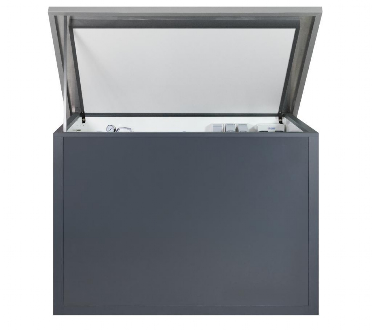 Součástí vybavení je frekvenčně řízené oběhové čerpadlo, prémiový filtr, kvalitní armatury a plně připravené hydraulické i elektrické rozvody. Tepelně izolovaná konstrukce chrání technologii před povětrnostními vlivy a umožňuje spolehlivý provoz i při venkovním umístění. Horní otevírání boxu zajišťuje snadný přístup pro servis a údržbu. Řešení je vhodné pro profesionální instalace, kde je požadována stabilní dezinfekce slanou elektrolýzou a čisté technické provedení bez nutnosti budování samostatné strojovny.