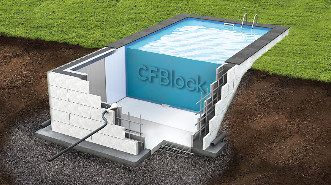 Sada prémiových tvárnic CF Block X P30 + P80 na bazén o velikosti 6 x 3 x 1,5 m. Sada obsahuje 61 ks tvárnic + 16 koncovek.