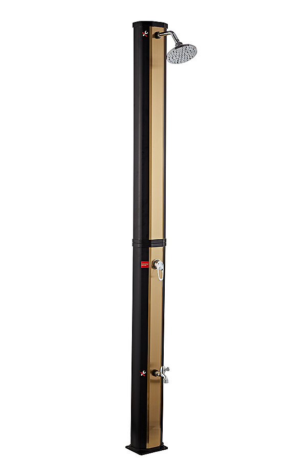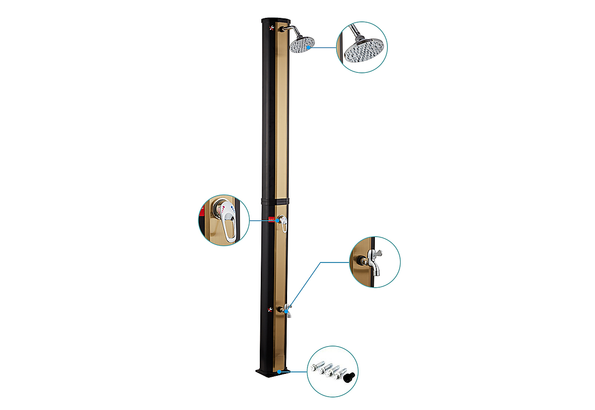 Solární sprcha NEOVA Korfu 35L v černo-zlatém provedení je perfektním doplňkem každé zahrady, terasy nebo okolí bazénu. Díky svému modernímu designu a ekologickému fungování bez potřeby elektřiny nabízí komfortní osvěžení a šetří náklady na energii. Tato sprcha využívá solární energii k ohřevu vody až na 60°C, což je ideální pro letní dny, kdy chcete mít k dispozici teplou vodu bez jakéhokoli zásahu do elektrické sítě.