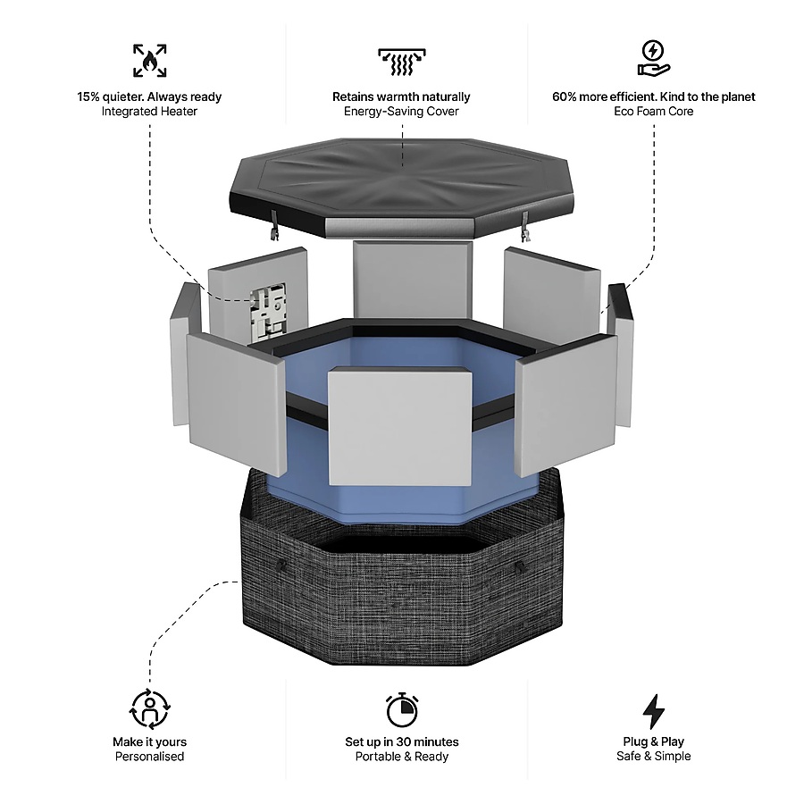 Díky unikátní pěnové konstrukci (Foam Spa) nabízí výrazně vyšší stabilitu než běžné nafukovací vířivky. Pevné stěny drží tvar, lépe izolují teplo a zajišťují maximální komfort při každém použití.