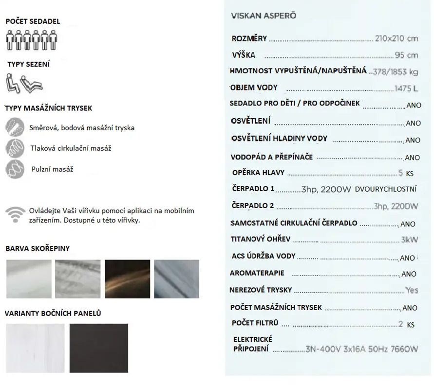 Šestimístná vířivka disponuje hlubokými rohovými pozicemi a pohodlným lehátkem. Asperö je vybavena kombinovaným vchodovým schůdkem, která lze využít i jako odpočinkové sedátko, místo které uvítáte po intenzivní masáži.