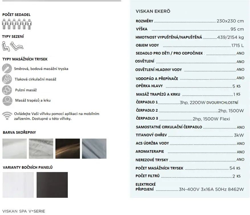 Viskan Spa V-Serie nabízí rozmanitost a luxus. Rozdílné rozměry, rozdílné tvary ale všechny mají společný cíl - nejlepší zážitek z masáže. Každá z vířivek nabízí bodové trysky, pulzační trysky a tlakovou cirkulační masáž. Modely V-Serie jsou dále vybaveny samostatně programovatelným cirkulačním čerpadlem a výkonnými hydromasážními čerpadly, z nichž vždy je minimálně jedno dvojrychlostní.