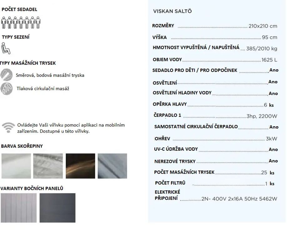 Viskan Spa S-Serie. Všechny modely této série mají společné nerezové trysky, čištění vody ozonem, samostatně programovatelné cirkulační čerpadlo, antibakteriální rozvody a prémiovou kvalitu a zpracování jako je zvykem u všech vířivek ViskanSpa.