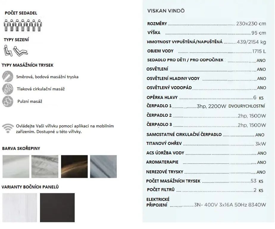 Od ostatních vířivek Viskan Spa liší pohodlným dvojmístem. Dvojmísta jsou v poslední dobře velice oblíbená např. v kinech, vytváří stylový a útulný prvek. Podobně jako ostatní modely ve V-Serii je Vindö vybavena rozšířeným balíčkem osvětlení, vodopádem, systémem ošetření vody ACS, který zajištuje mnohem příjemnější péči o čistotu vody než u konkurenčních modelů.