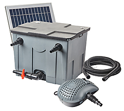 Hybridní a snadno použitelný systém pro zahradní jezírka do objemu 8 m3 (s rybami 4 m3), filtrace včetně 4 filtračních hub, výkon čerpadla 3500 l/h, 2x 18V krystalický solární panel. Rozměry 52 × 40 × 40 cm. Přes den pracuje na solární energii a v noci se automaticky přepne přes adaptér na energii ze sítě, takže zajišťuje efektivní cirkulaci vody 24 h denně.