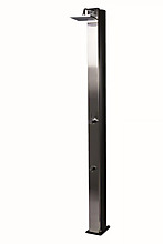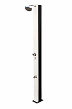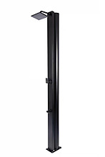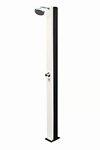 Luxusní solární sprcha, objem zásobníku 38 l, výška 218 cm, velká sprchovací hlavice, kohoutek na oplach nohou. Vyrobena z hliníku a nerezu, kovová páková baterie.